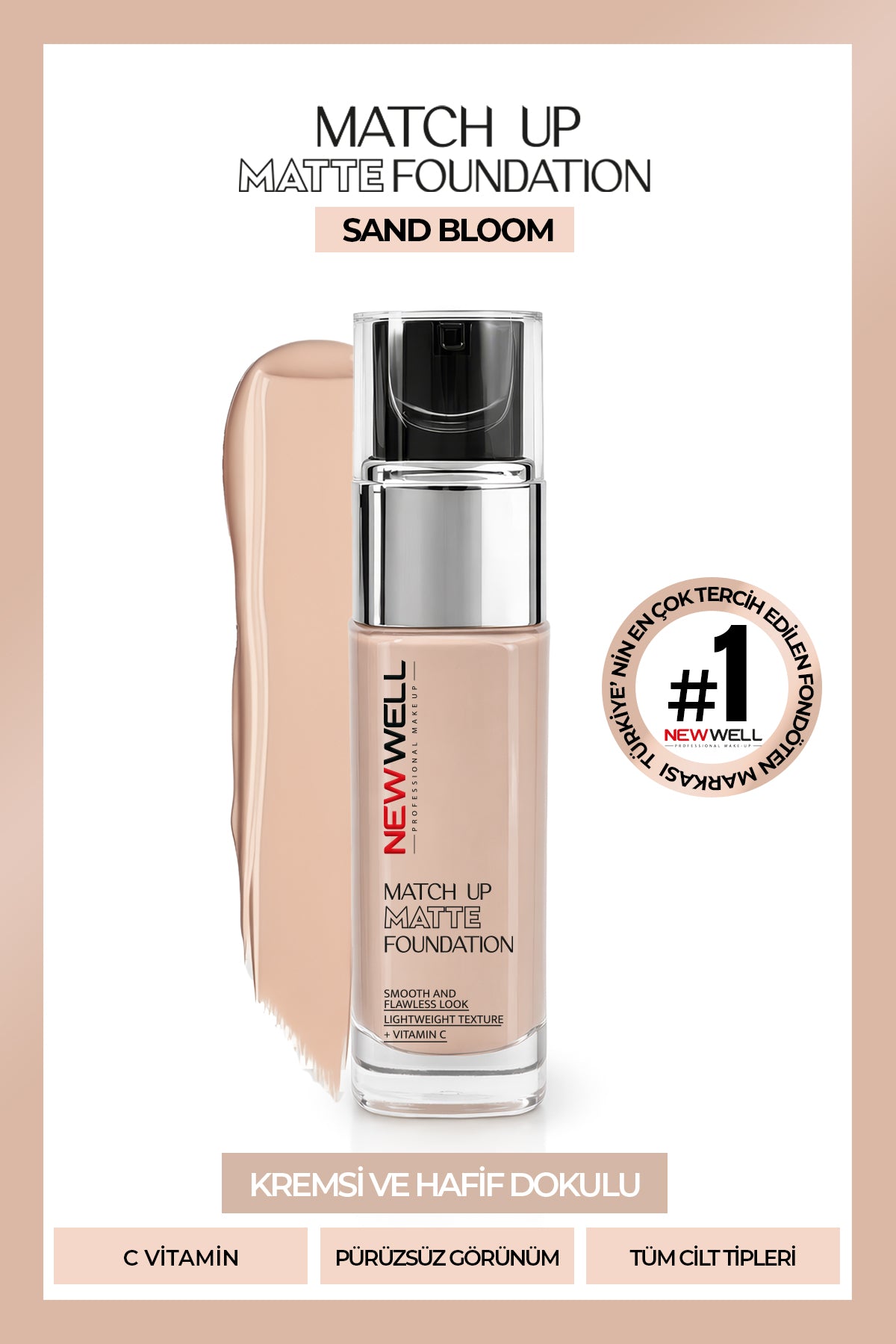 Match Up Matte Foundation, ciltle uyumlu yapısı sayesinde pürüzsüz, kusursuz ve doğal mat bir görünüm sunar. Hafif dokusu ve C vitamini içeren formülüyle gün boyu konforlu kullanım sağlar.